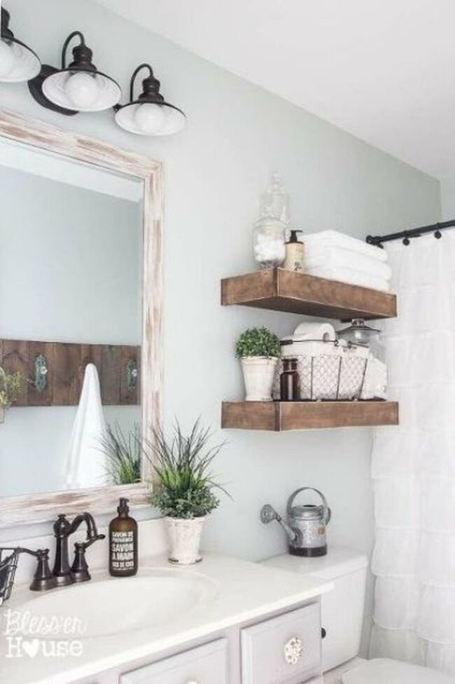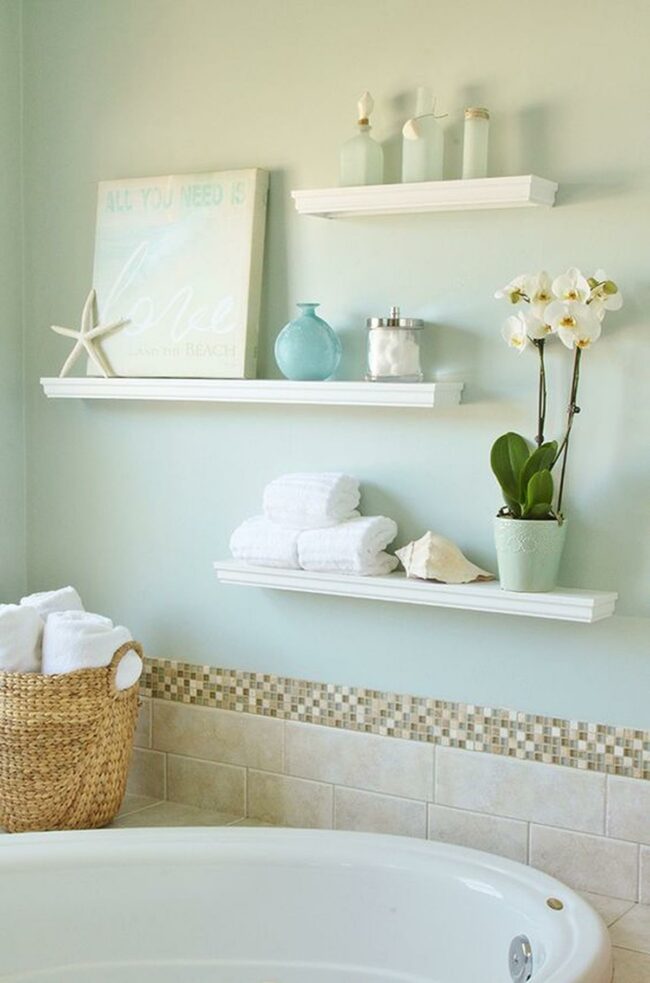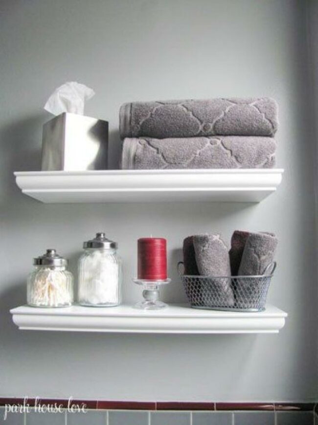 Perfectly organized bathrooms make life easier with these two white shelves holding everything in their proper place.