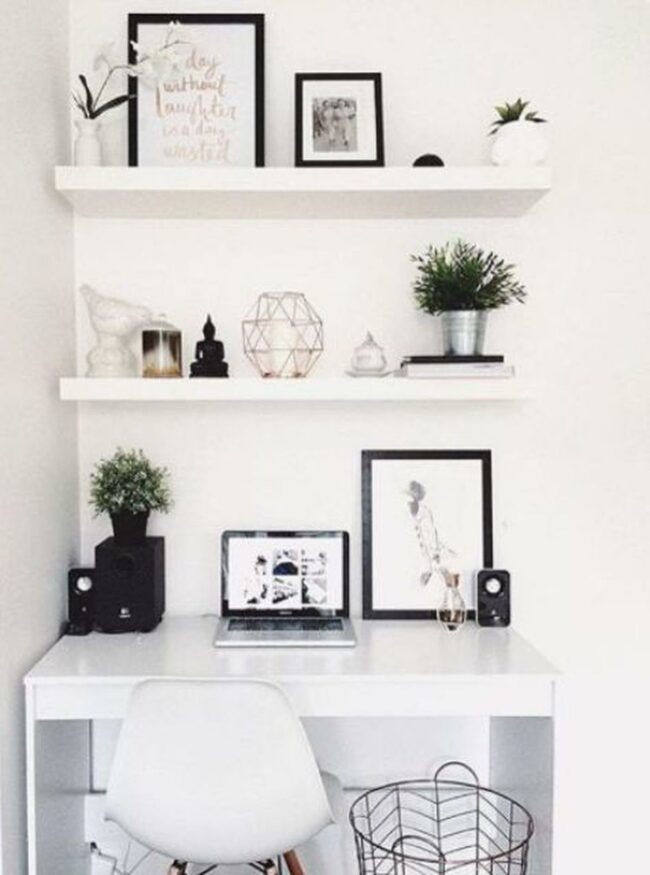 Neat decorations including plants, books, and framed pictures occupy small shelves without overwhelming the space.