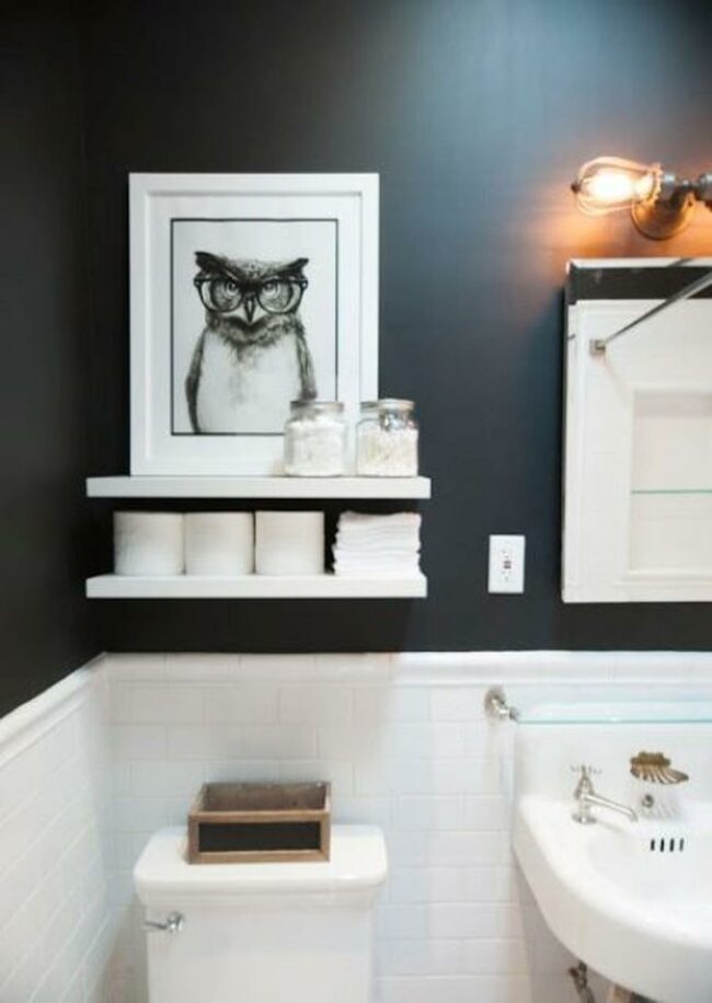 Dark walls meeting crisp white tiles create a fresh bathroom atmosphere where a charming owl sketch adds personality above the toilet.