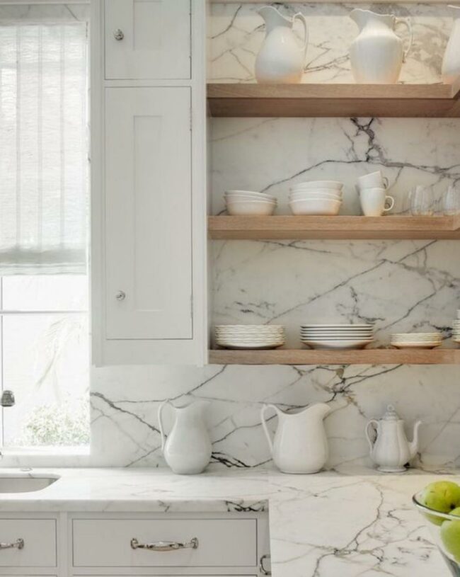 Modern charm fills this kitchen where white marble counters showcase elegant dark veins that match perfectly with the coordinating backsplash.