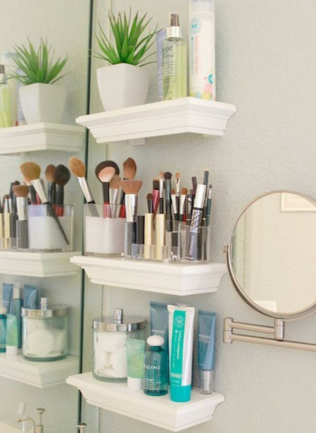 These simple shelves turn an ordinary corner into a dedicated beauty station without taking up valuable counter space.