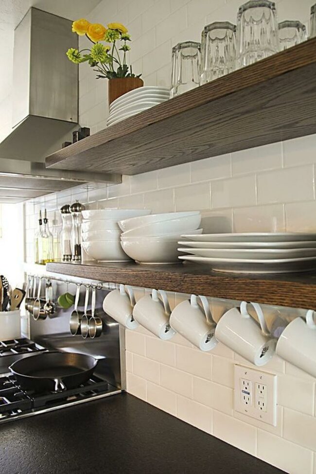 Hanging mugs form an orderly row underneath, adding charm while saving valuable counter space.