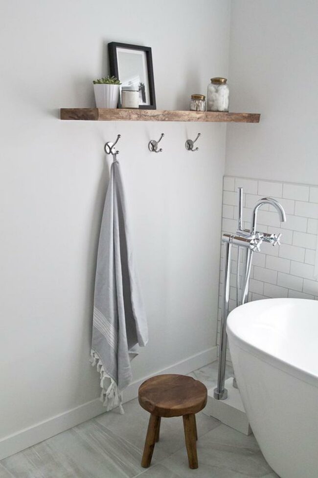 A wooden shelf positioned above towel hooks displays simple decorative items including potted greenery and a casually leaning framed picture.