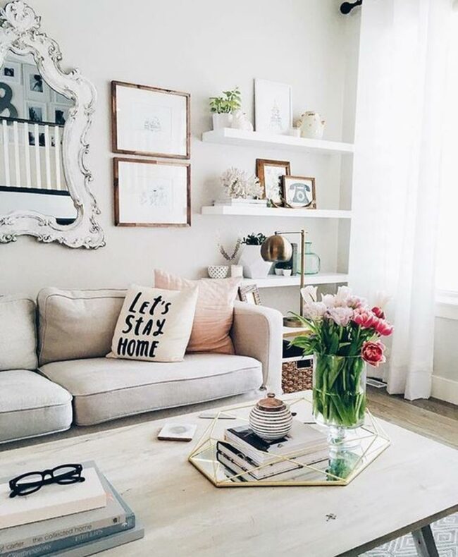 Perfectly arranged white floating shelves showcase carefully selected art pieces and decorative items that bring personality to this inviting corner.