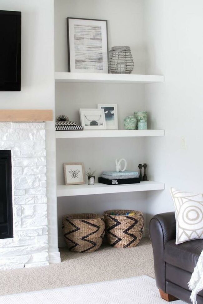 White floating shelves showcase woven baskets and tasteful decorations that add natural texture without overwhelming the space.