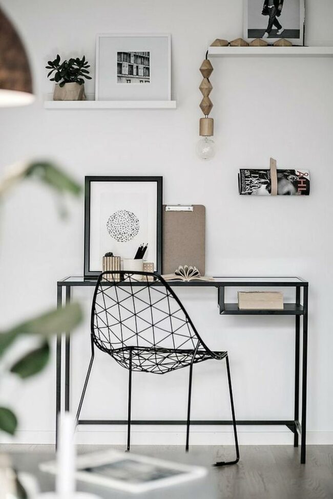 Glass sits atop thin black frames in the simple desk, offering both style and function.