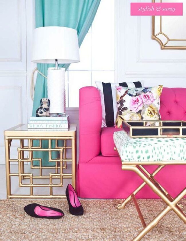 Pink magic happens in this cheerful room where a bold chair with gleaming gold legs steals the spotlight.