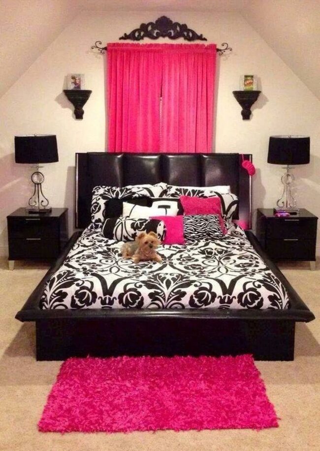 Black, white, and hot pink create a dazzling bedroom that instantly grabs your attention.