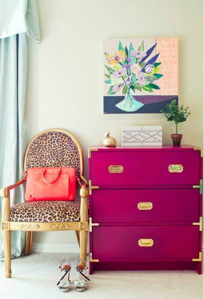 Magenta chest of drawers makes a bold statement against the light walls, instantly grabbing your attention when entering the room.