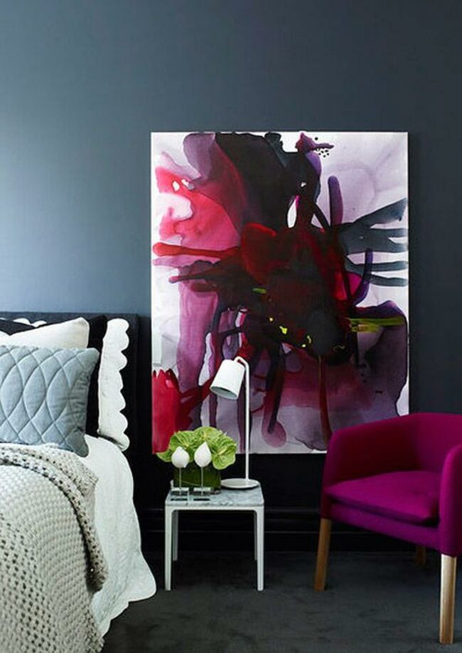 Bold deep pink walls immediately capture your attention in this eye-catching bedroom where a modern black and white abstract painting hangs perfectly above the bed.