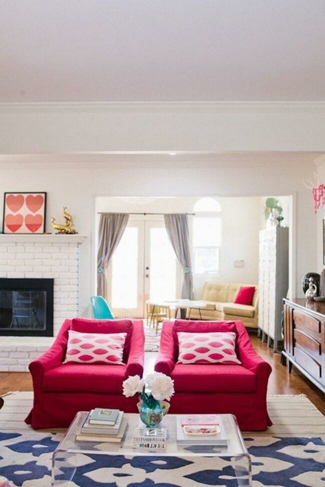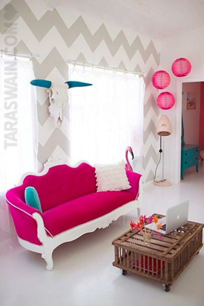 That eye-catching pink and white living room instantly lifts your mood with its cheerful vibe and fun design elements.