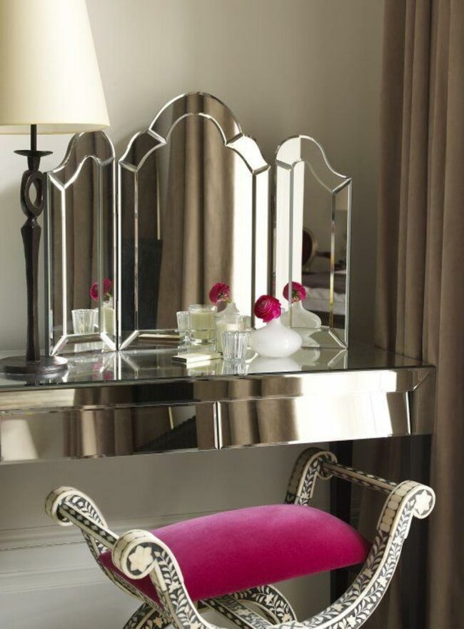 The ornate mirror above the sofa cleverly bounces light around the room, making the space feel more expansive and airy.