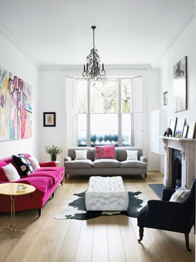 The eye-catching pink sofa stands out as the room's centerpiece, perfectly balanced by its understated gray companion.