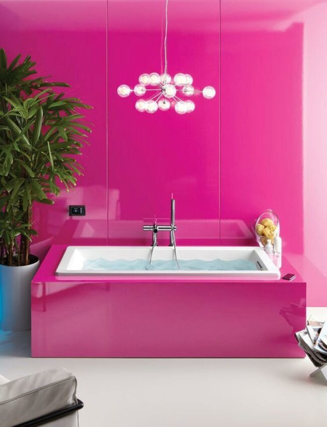 Pink walls instantly grab attention in this eye-catching bathroom where a sleek tub with crystal-clear water serves as the centerpiece.