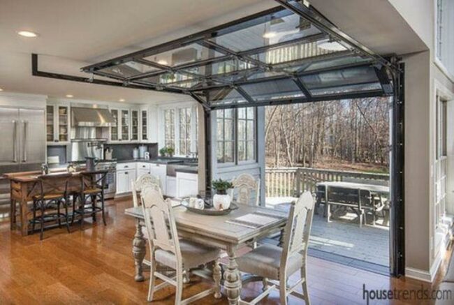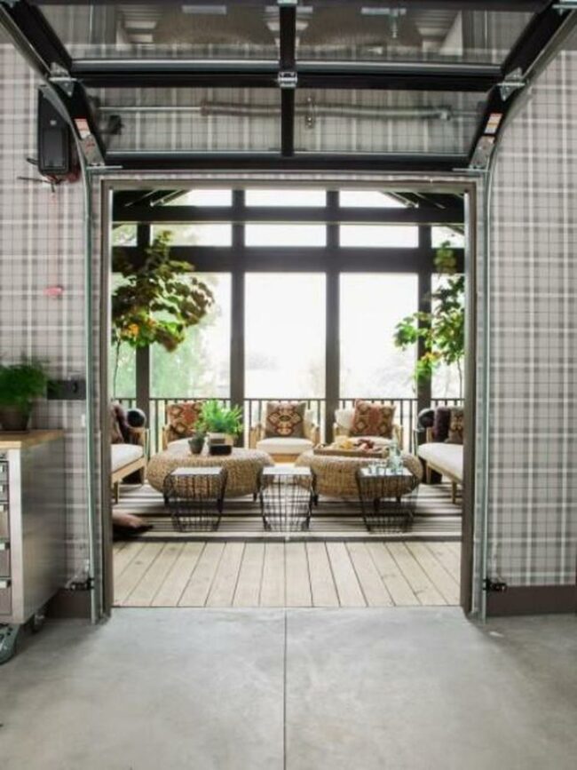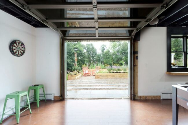 Natural light streams through glass panels in the garage-style door, connecting the inside with the outside world.