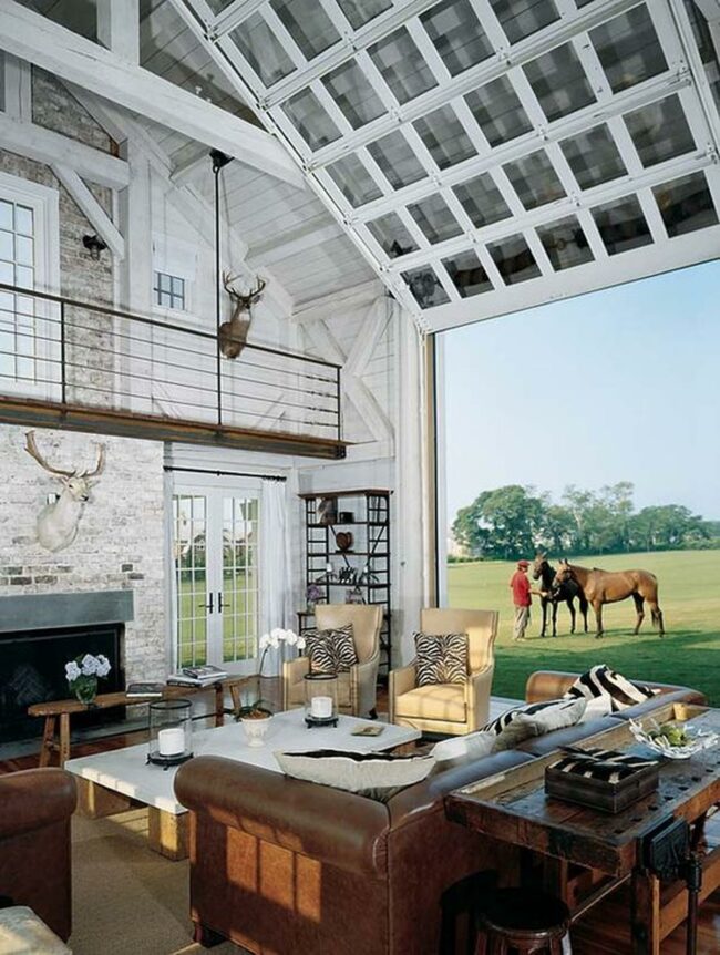 Stunning white wooden beams stretch across the ceiling, creating an open atmosphere where nature meets comfort through the large garage-style glass door showcasing green fields and horses.