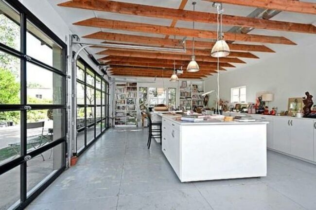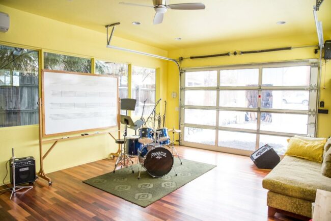 Sunshine floods this cheery yellow music studio through massive windows and a stylish glass garage door, creating the perfect spot for any aspiring musician to play.
