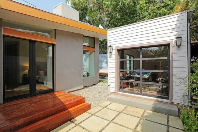 Modern wooden steps lead to spacious glass doors in this refined outdoor area where light gray tiles create an organized pathway between two distinct structures.