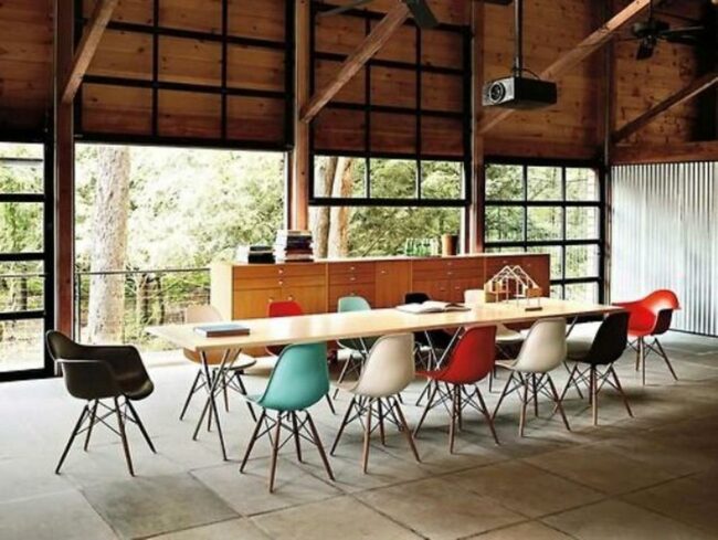 Modern chairs in bold red, white, black, and blue hues surround a substantial wooden table that anchors the room.