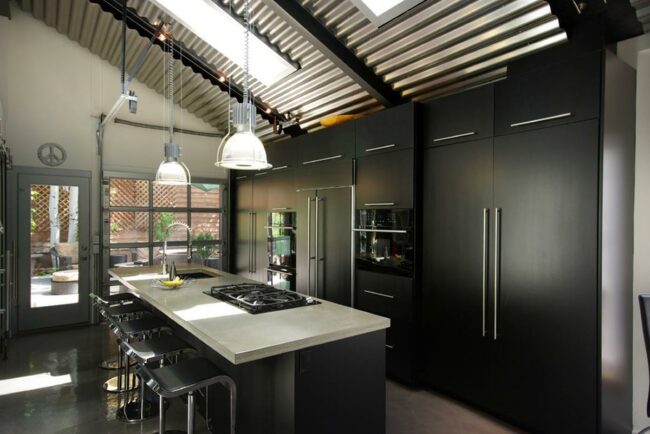 Hanging lights above the island add a clean glow that complements the industrial feel from exposed beams and metal panels on the high ceiling.