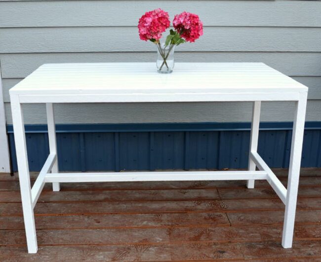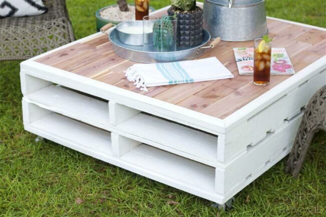 White wooden pallets transform into a simple table with a smooth natural wood top, creating an inviting centerpiece.