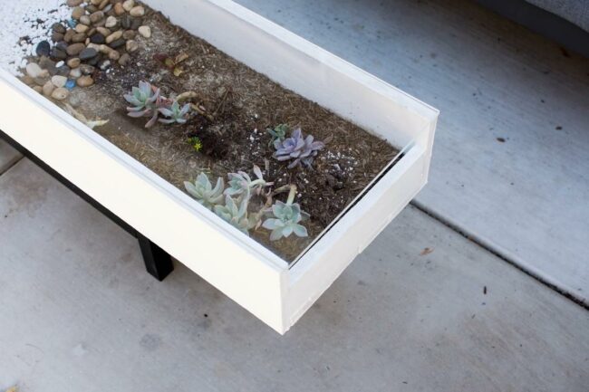 White-painted wooden boxes perched on slim black legs showcase lush succulents nestled in rich brown soil.