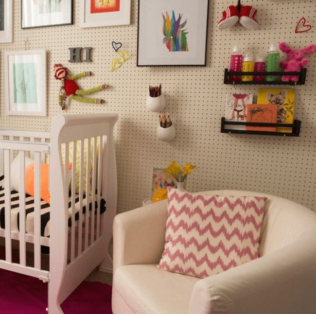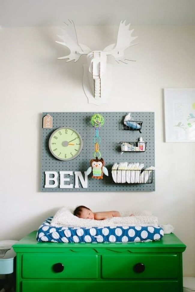 Clever pegboard walls allow for easy display of cute art prints and a small stuffed doll that can change as your baby grows.