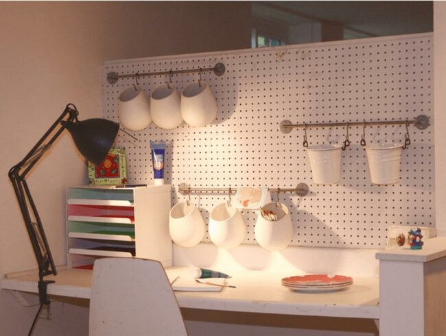 Small details like the evenly spaced holes in the pegboard contribute to the overall sense of order without feeling rigid or stuffy.
