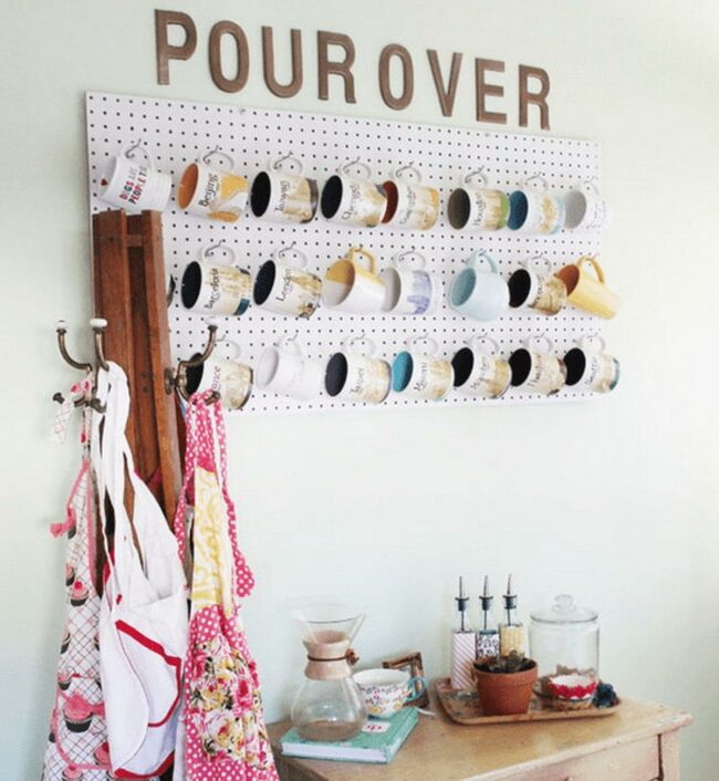 Colorful mugs displayed on a pegboard add personality while showing off your collection in a clever way.
