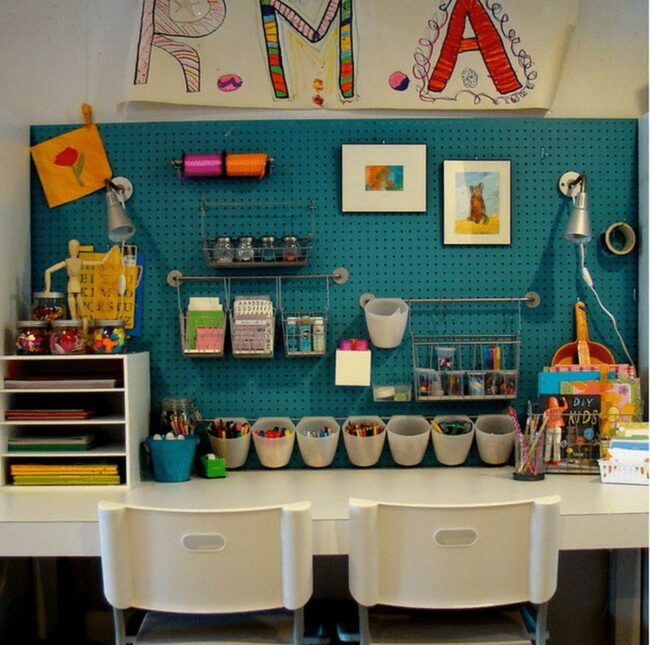 Kids can unleash their creativity in this cheerful room where a white pegboard organizes art supplies and showcases their colorful drawings.