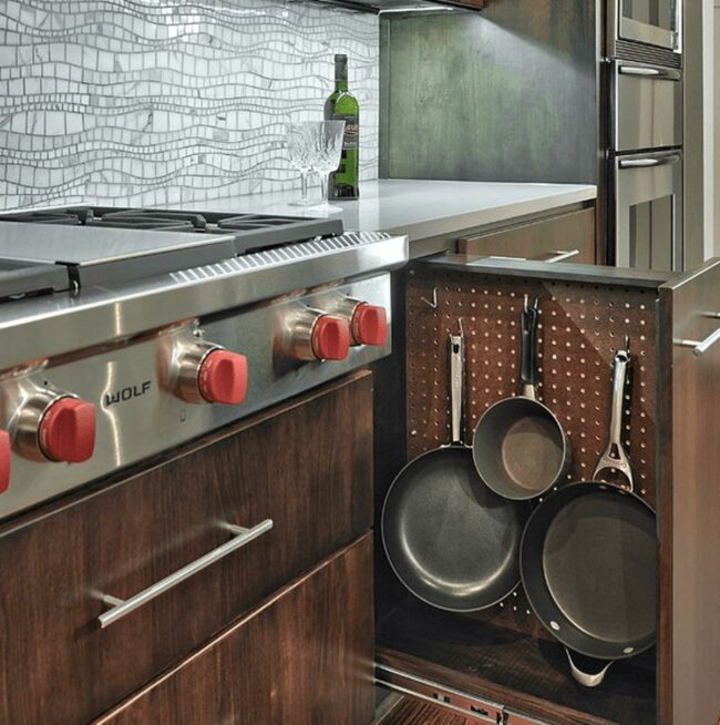 Pull-out cabinets with hanging pots and pans keep all cooking tools within easy reach when you're preparing meals.
