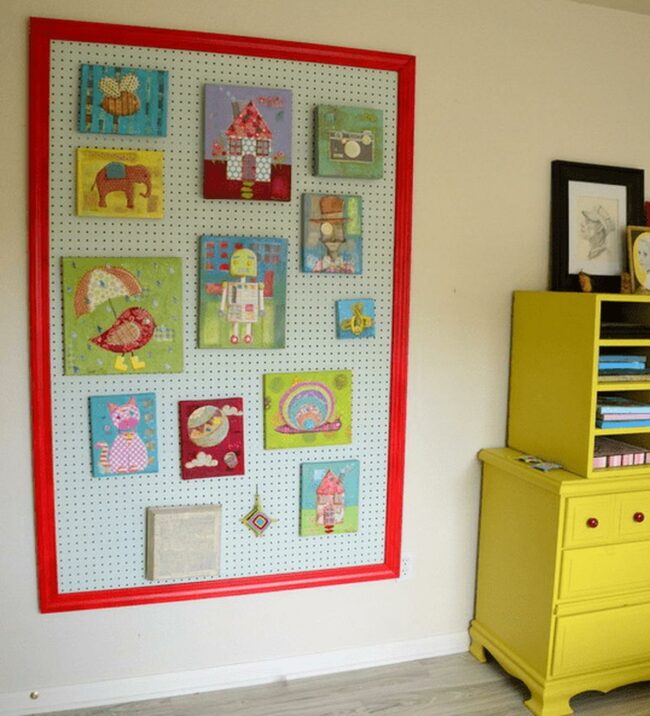 Red frames surround a playful pegboard where animal art and fun designs create a focus point that draws everyone's attention.
