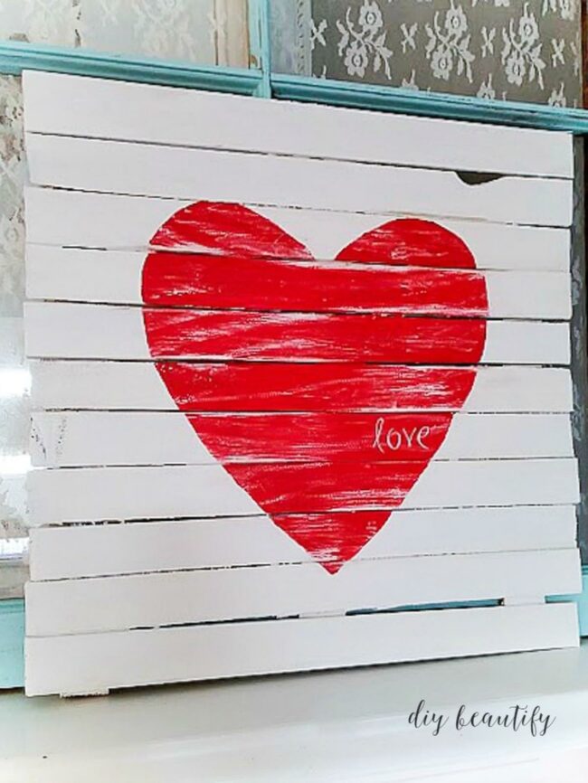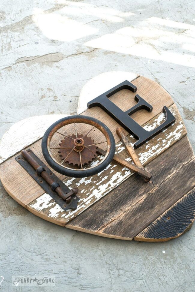 Small letters spelling "love" nestle inside the heart's worn paint, adding personal charm.