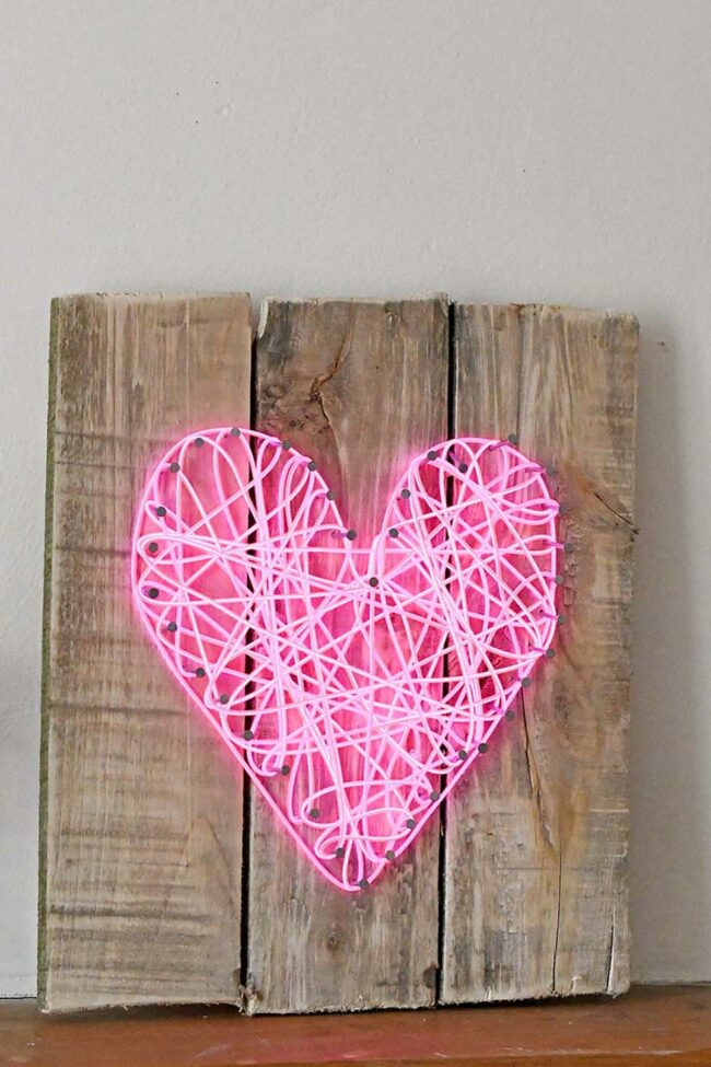 String art centers the scene with a handcrafted heart-shaped piece that radiates intimate creativity.