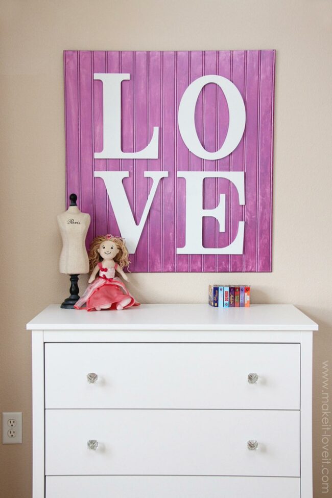 Mounted purple wooden boards with "LOVE" letters add personality to the space.