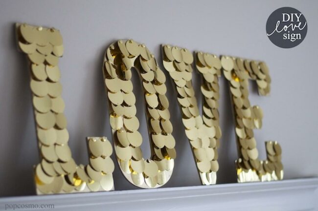 Love letters are a stunning wall decoration that instantly grabs attention with their bold gold shapes and reflective round discs.