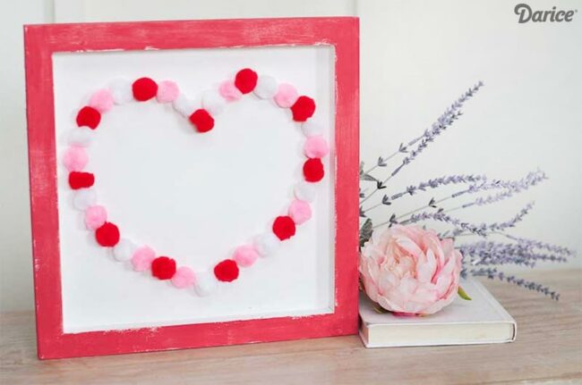 Small red wooden frames highlight adorable heart shapes crafted from tiny pink, white, and red pom-poms.