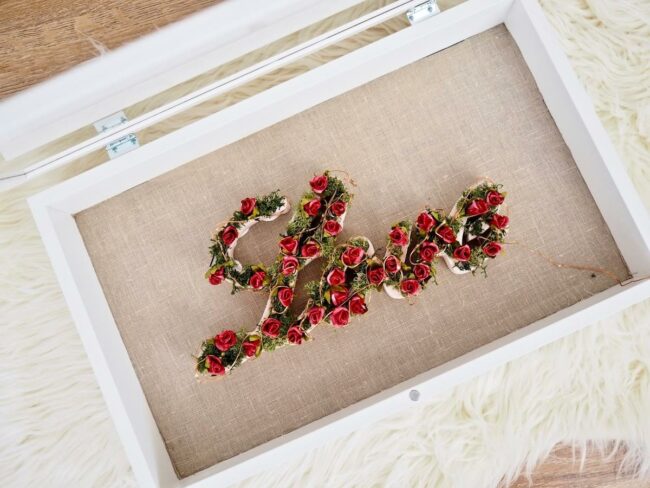 Love flower art is a charming display that spells out emotions using delicate red blossoms.