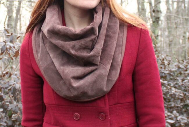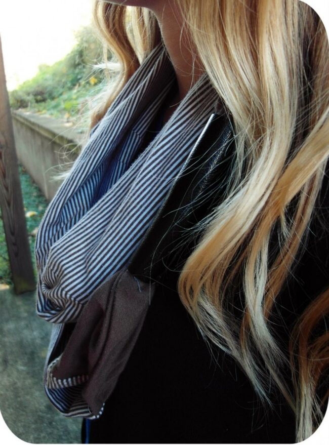 Brown scarves with visible stitching add unexpected texture and depth to simple ensembles.