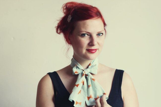 Orange fish pattern on her scarf introduces whimsical charm to the ensemble.