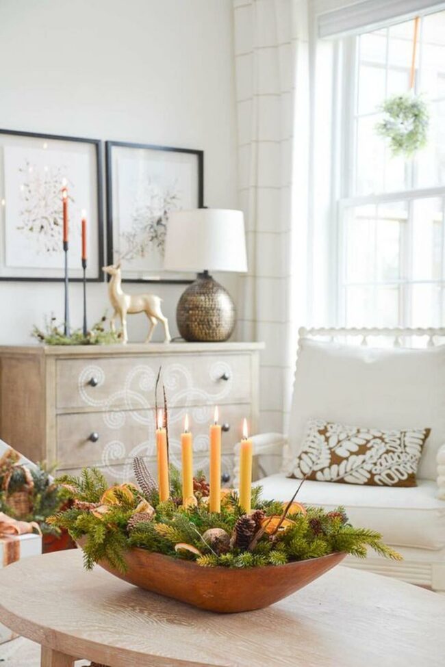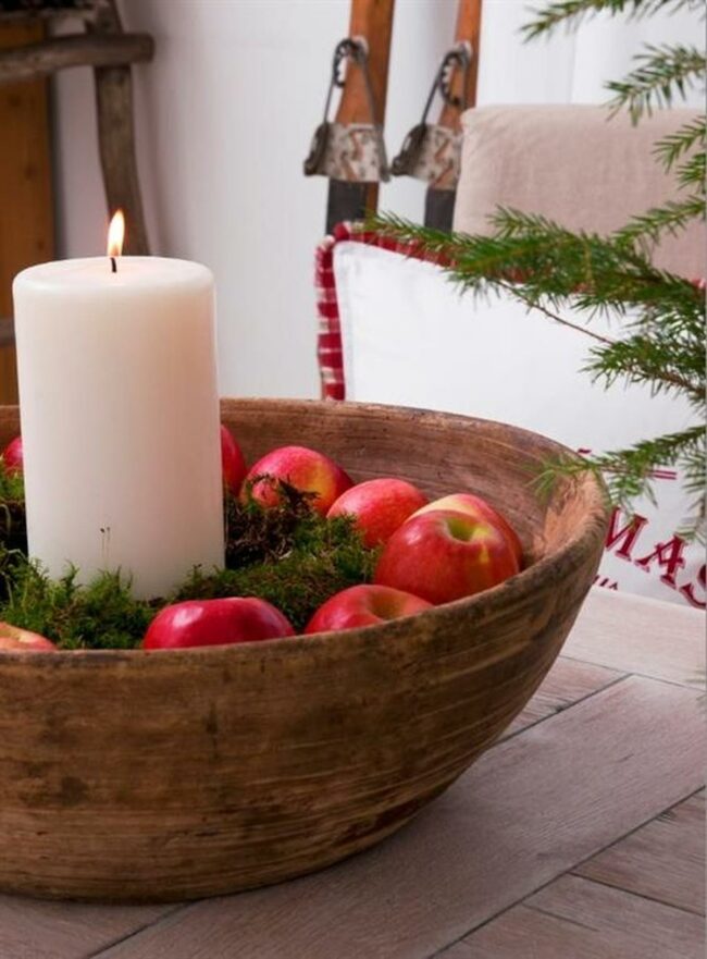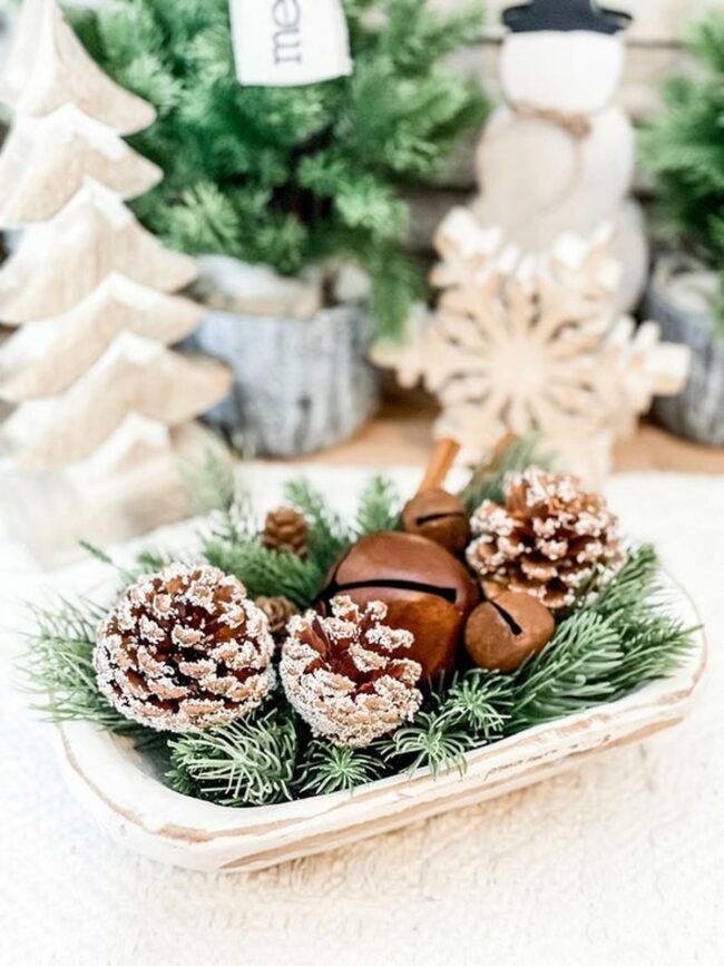 A smooth wooden bowl filled with pinecones, green branches, and white berries brings an outdoorsy freshness to the scene.