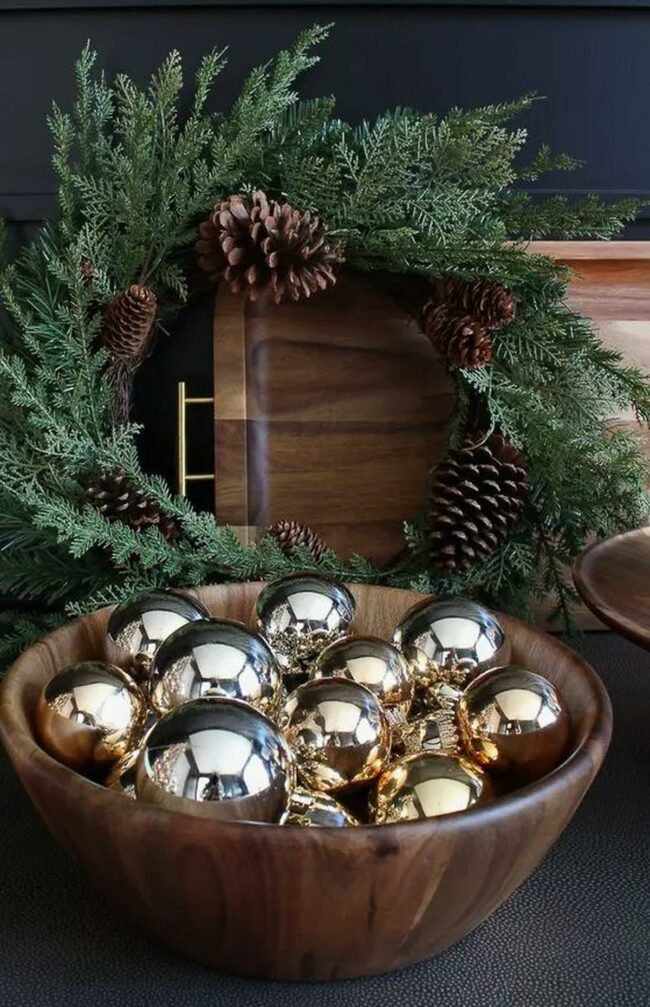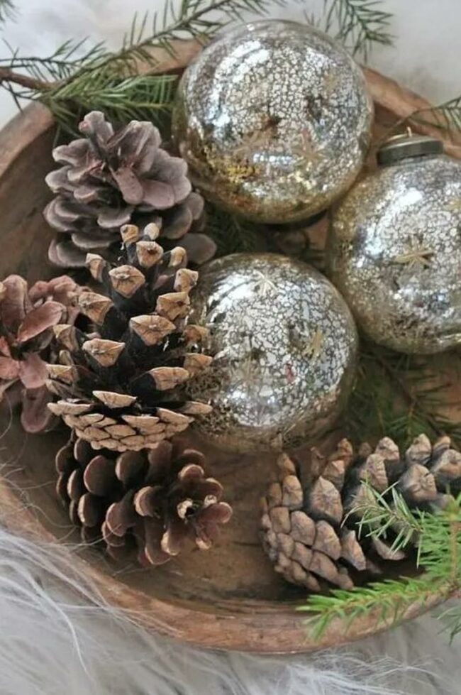 Holiday decor collections bring natural charm through rustic pinecones and shiny silver ornaments nestled in a wooden bowl.