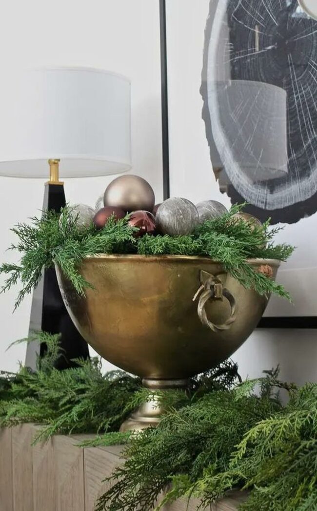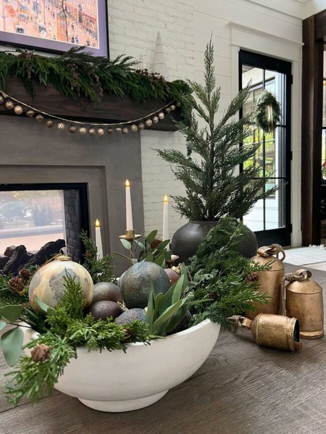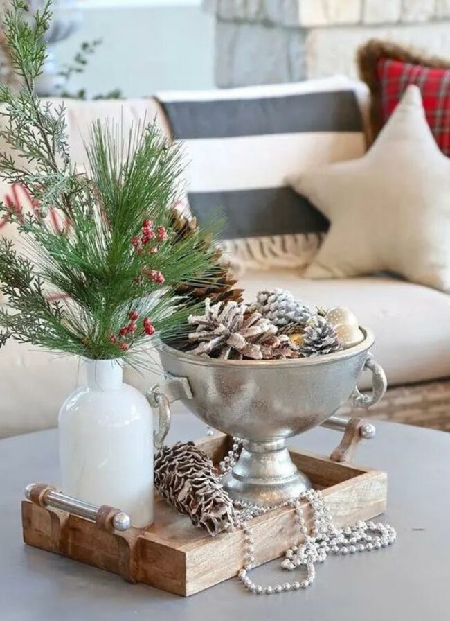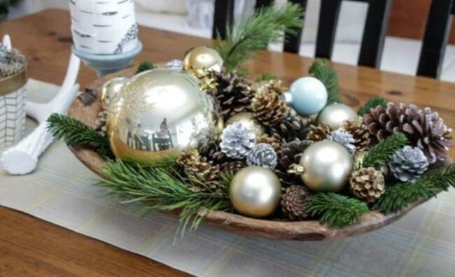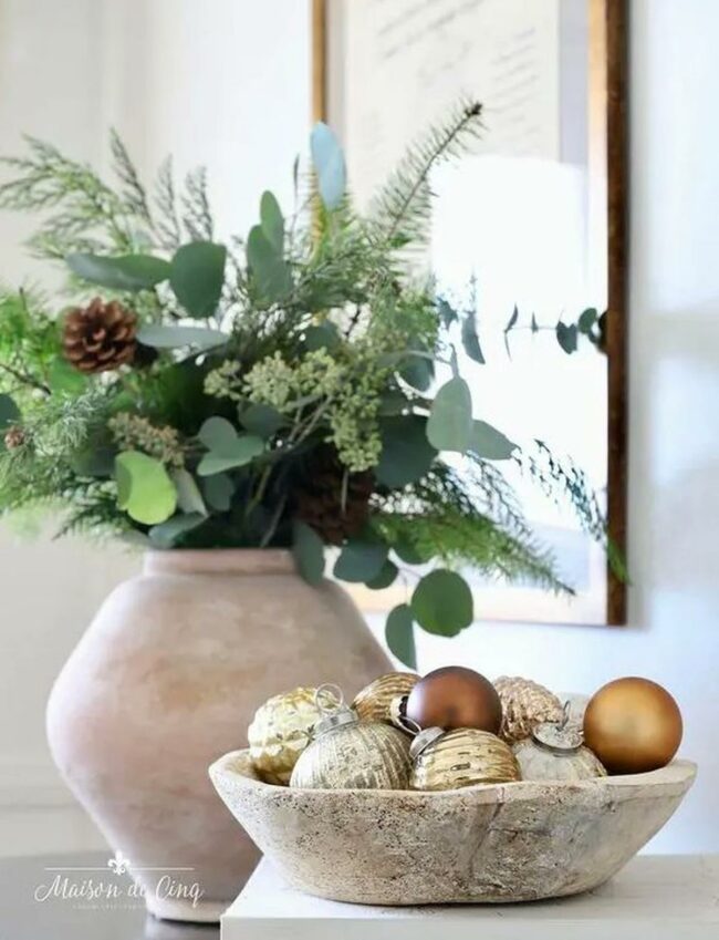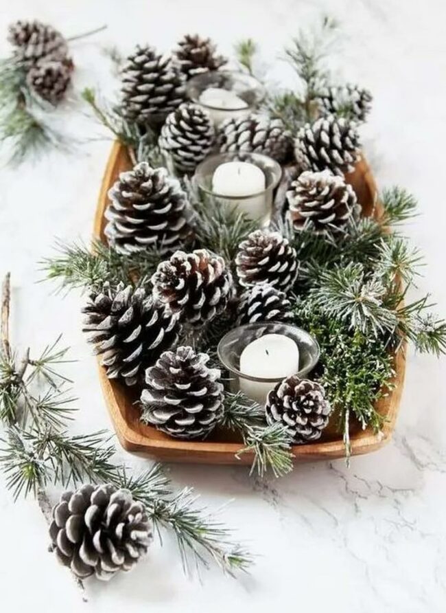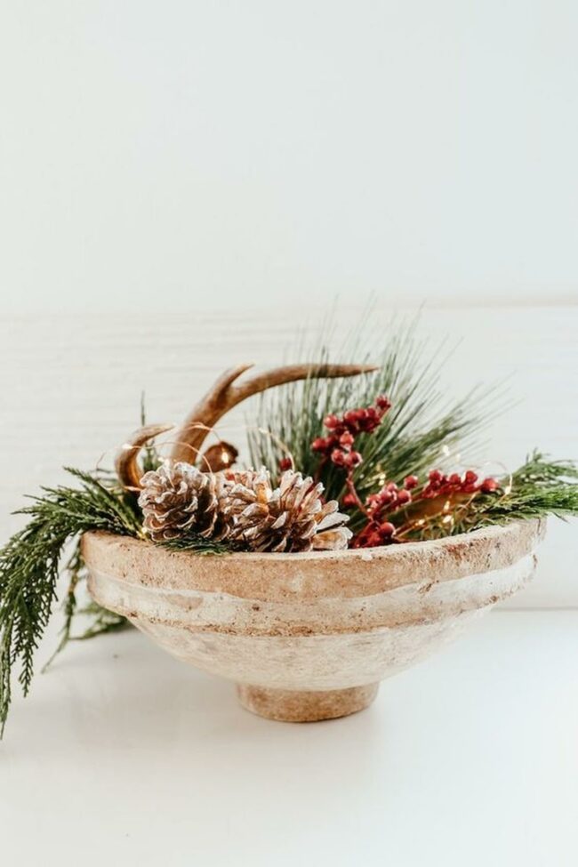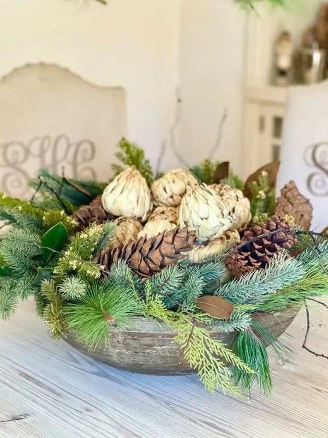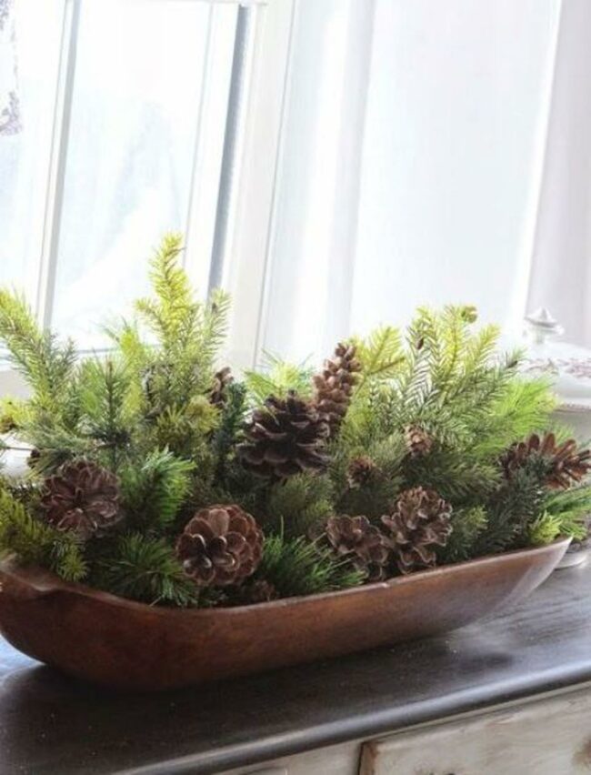 Pine branches and small pinecones surround the bowl, bringing natural textures into the arrangement.