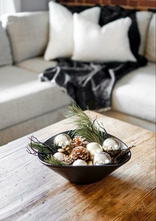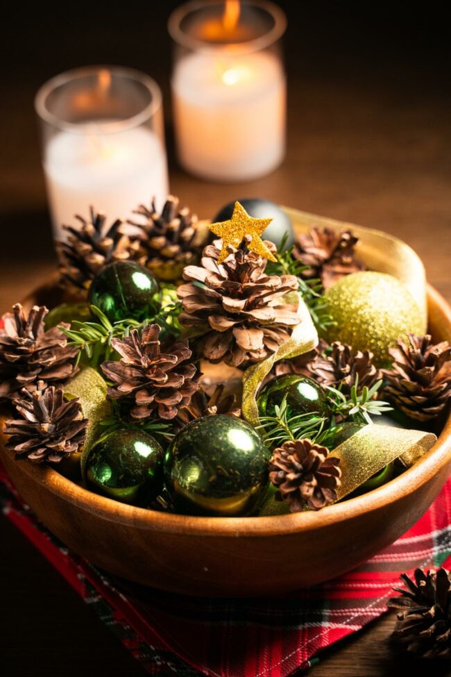 Round decorations and shiny pinecones nestled in a white bowl catch the light beautifully.