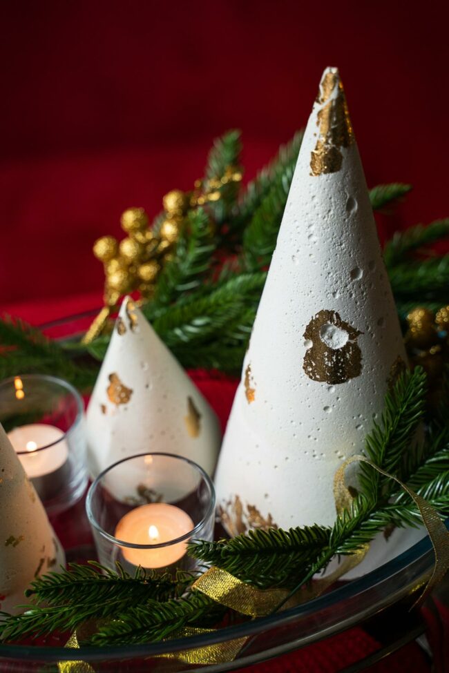 Glittery cone-shaped trees add height and dimension to the arrangement.