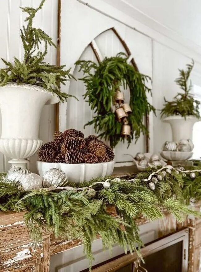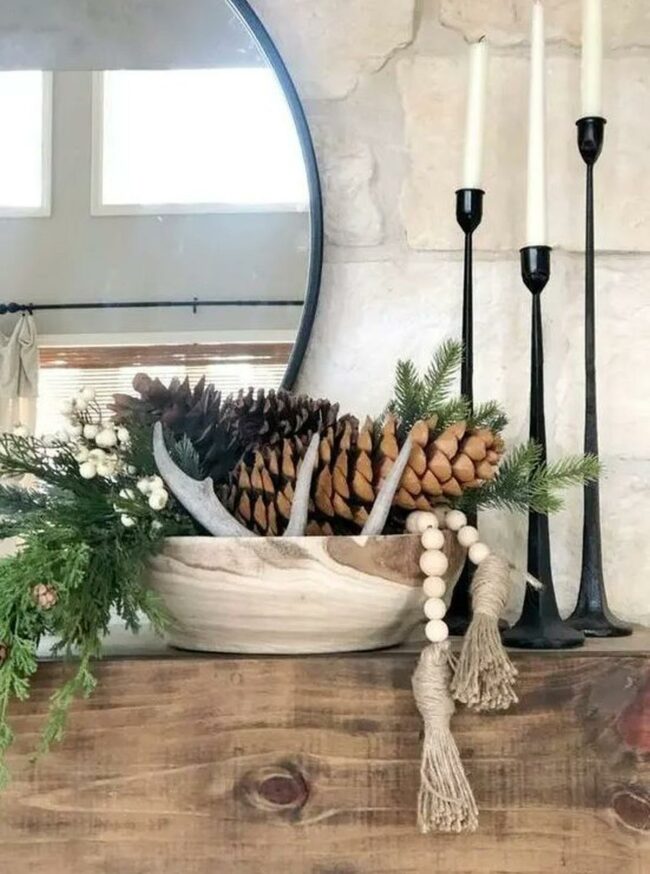 Pine branches and pinecones bring outdoor elements inside, connecting the space to nature.