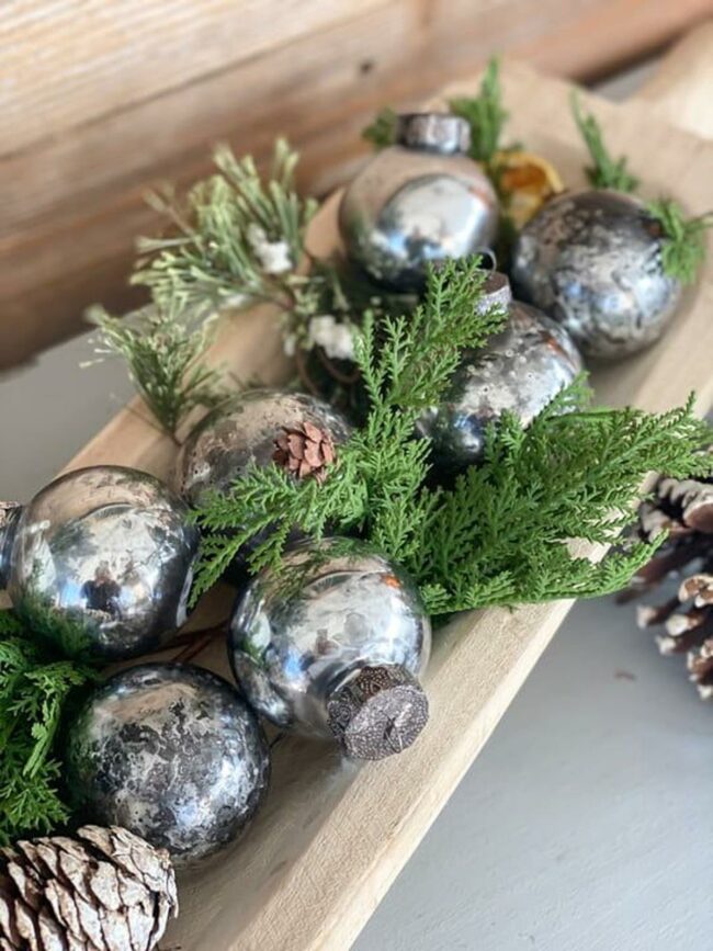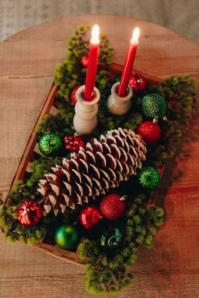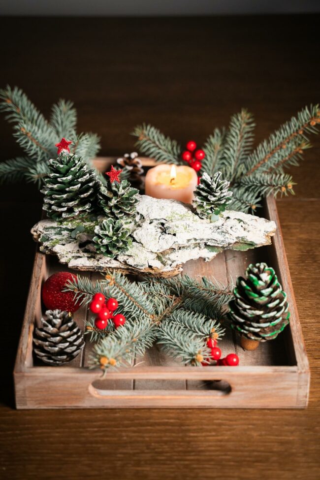 Shiny red and green ornaments sparkle strategically across the wooden tray's surface.