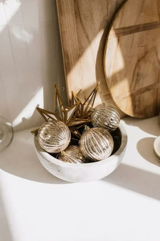 Silver and gold ornamental spheres sparkle inside a golden dish, creating an instant visual feast.