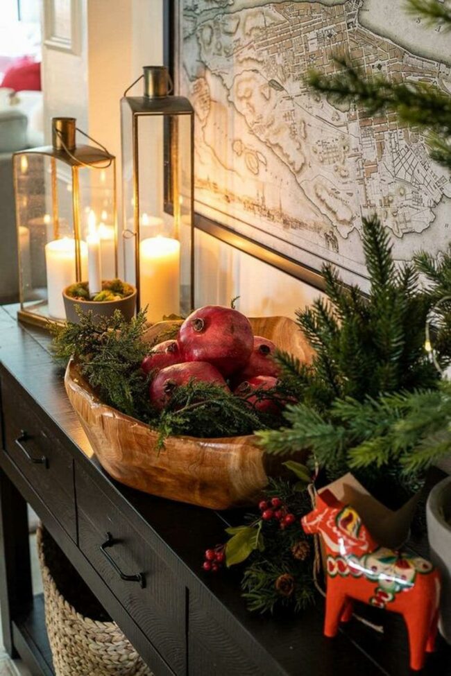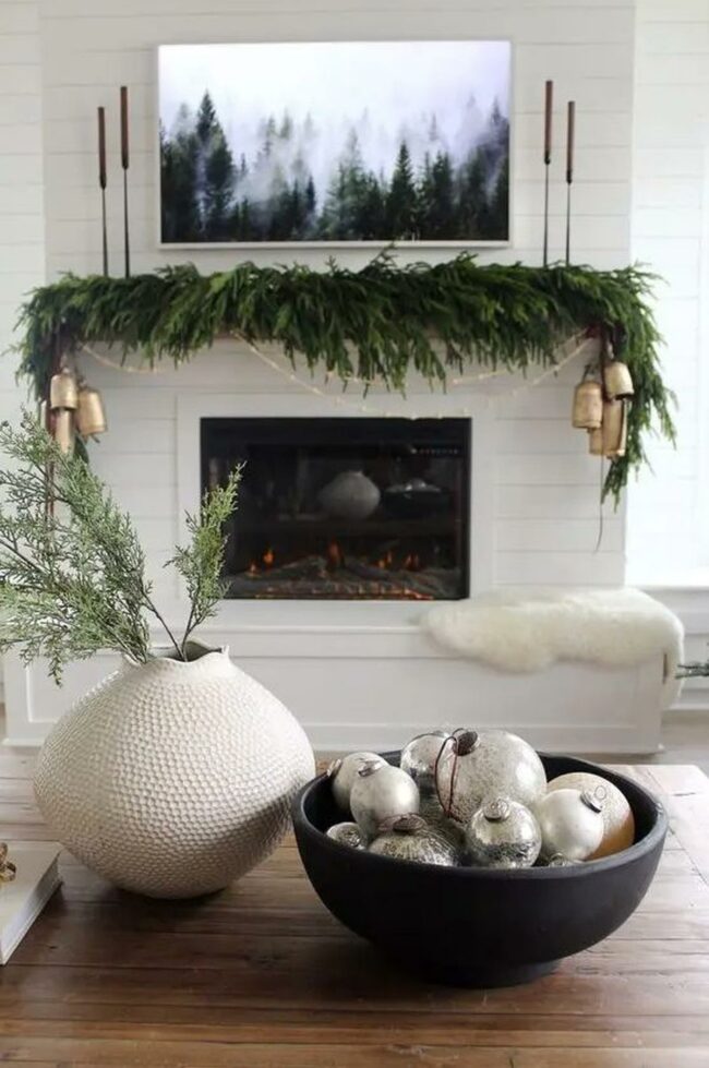 Green pine branches peek out from decorations, bringing natural elements indoors.