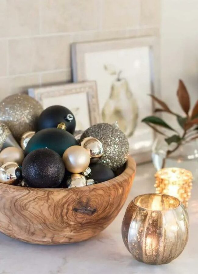 Silver, gold, and black ornaments shine brilliantly inside a wooden bowl, creating a stunning centerpiece on smooth marble.